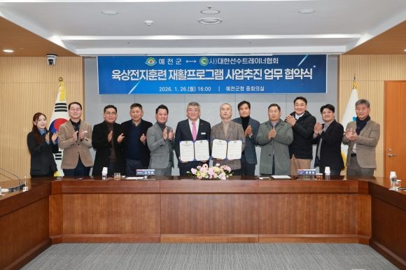 예천군이 지난 26일 청내 중회의실에서 (사)대한선수트레이너협회와 육상전지훈련 재활프로그램 사업추진을 위한 업무협약을 체결 했다.