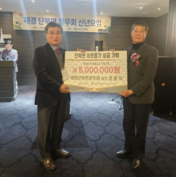 | 지난 23일 개최된 ‘2026년 재경 단북면 향우회 신년회’에서 재경 단북 향우회 장용득 회장이 성금 1000만 원을 기탁했다.
