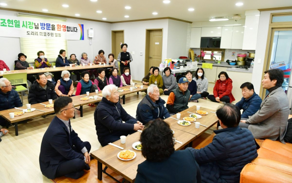 | ↑↑ 조현일 경산시장(오른쪽)이 진량읍을 시작으로 남부동까지 한 달간 15개 읍면동을 순회하며 주민들과 직접 대화에서 하양읍 도리리경로당 간담회가 열리고 있다. 경산시 제공 |