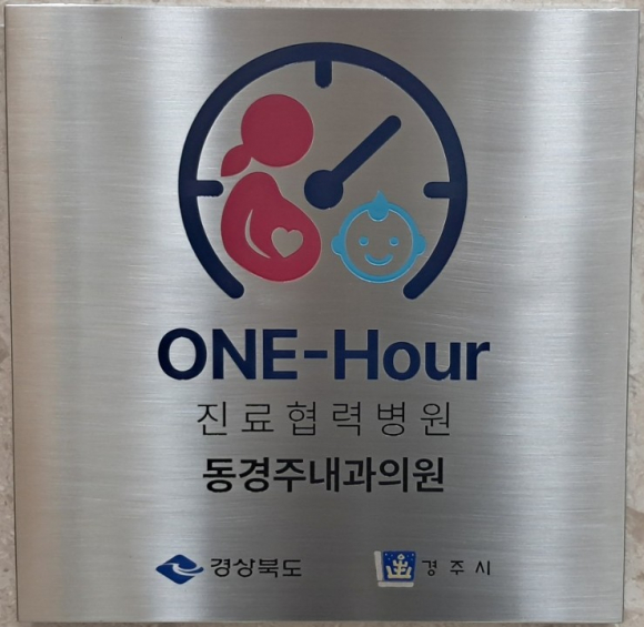 | ↑↑ 경주시 산부인과,소아과 ONE-hour 진료협력병원으로 지정된 '동경주내과의원' 현판<경주시 제공> |