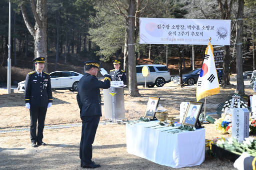 문경소방서가 지난 1일, 국립대전현충원 소방공무원 묘역을 찾아 문경 육가공공장 화재 현장에서 인명 구조 중 안타깝게 순직한 故 김수광 소방장, 故 박수훈 소방교 2주기 추모식을 거행했다.