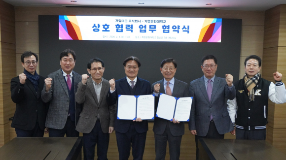 | ↑↑ 계명문화대학교 박승호 총장과 거림테크㈜ 이창원 회장 등이 계명문화대학교 동산관 대회의실에서 산학협력 협약식을 갖고 기념촬영을 하고 있다. 계명문화대 제공 |