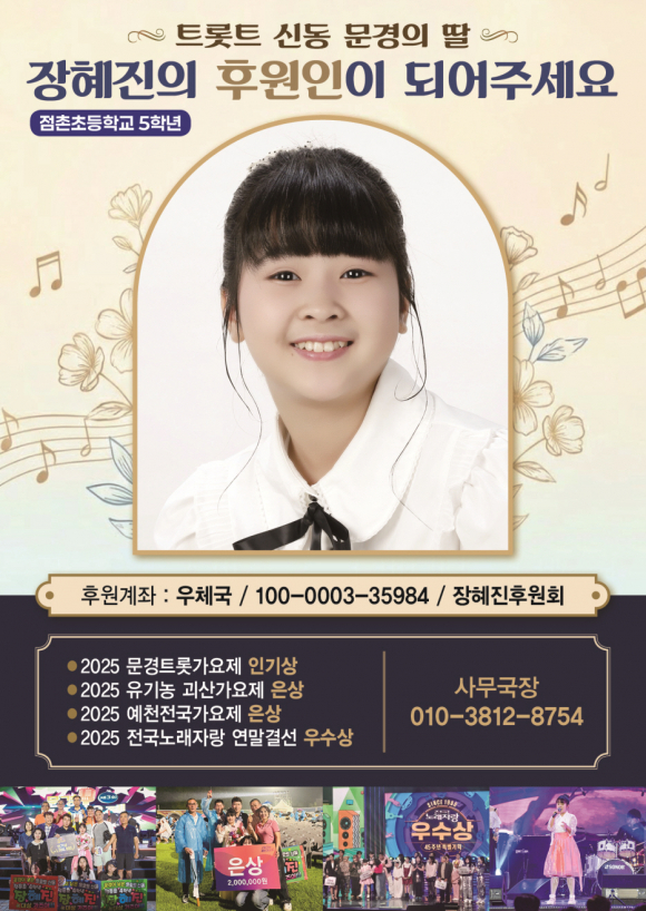 | -장혜진 후원 포스터. | 문경 점촌초 5학년생인 트로트 신동 장혜진(12)양 음악 활동을 돕기 위해 문경시민과 장씨 종친회 등이 후원회를 결성하고 본격 지원에 나섰다.