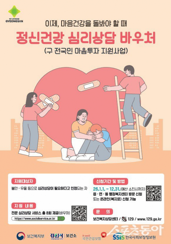 경산시(시장 조현일)가 우울, 불안 등 정서적 어려움이 있는 시민에게 대화 기반의 전문심리상담 서비스를 제공하는 '정신건강 심리상담 바우처사업'을 시행한다. 이 사업은 전문적 심리상담 서비스 바우처를 제공해 시민 마음 건강을 돌보고 자살을 예방하며, 정신질환을 사전 예방하는 것을 목적으로 한다.