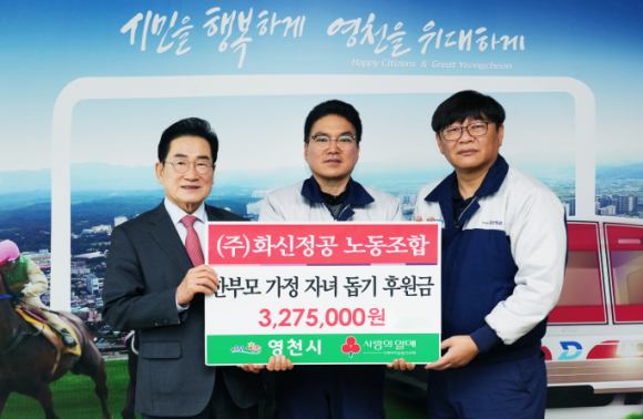 영천시에 지난 9일 도남공단 소재 ㈜화신정공 노동조합에서 한부모가정에 후원금 327만 5000원을 기탁했다.