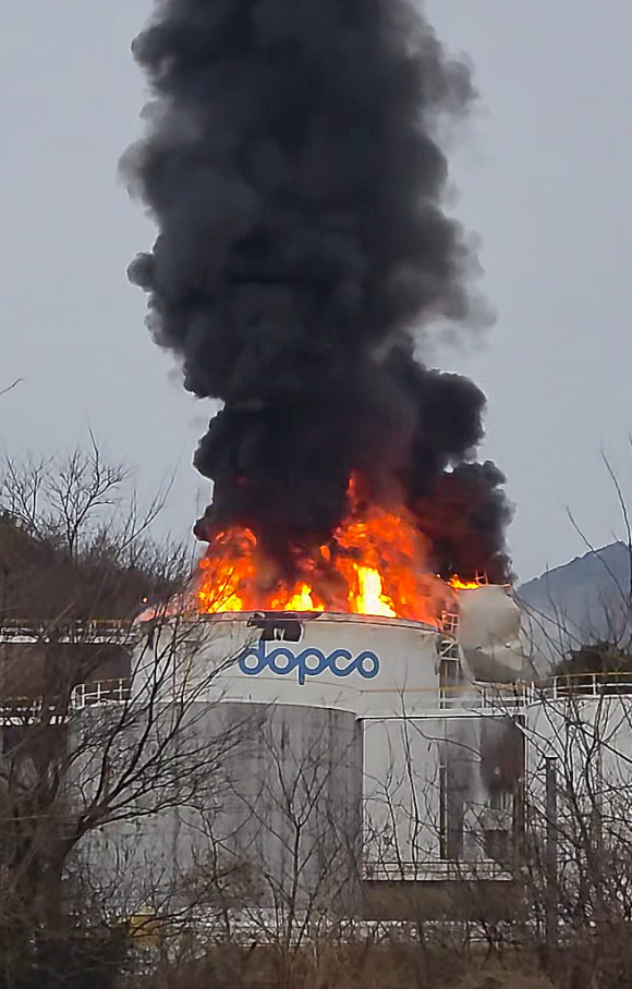 10일 오전 7시 47분 경 경산 하양읍 대한송유관공사 영남지사 경산저유소 옥외탱크저장소에서 폭발과 함께 불이 치솟고 있다.<독자제공 영상캡처. 뉴스1> |