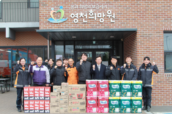 ↑↑ 영천소방서-소방안전협의회, 영천희망원을 방문하여 위문품 전달 및 시설 관계자·입소자들과 덕담 후 기념촬영을 하고 있다.<영천소방서 제공>
