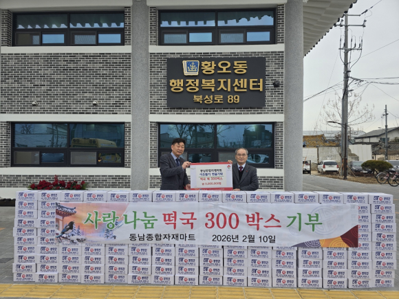 경주 황오동 소재 동남종합자재마트가 지난 10일 동 행정복지센터를 방문해 떡국 떡 300박스(300만 원 상당)를 전달했다.