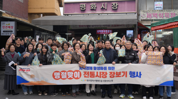 | 배기철 대구 행복진흥사회서비스원 이사장이 설을 앞두고 침체된 지역 민생 경제를 살피기 위해 현장 행보에 나섰다. 대구행복진흥원은 지난 11일 오후, 대구 평화시장을 찾아 배기철 이사장과 임직원 80여 명이 참여한 가운데 ‘설맞이 전통시장 장보기 행사’를 진행했다. 이번 방문은 고물가와 소비 심리 위축으로 어려움을 겪는 지역 상인들을 격려하고 전통시장 이용 활성화를 도모하기 위해 마련됐다.