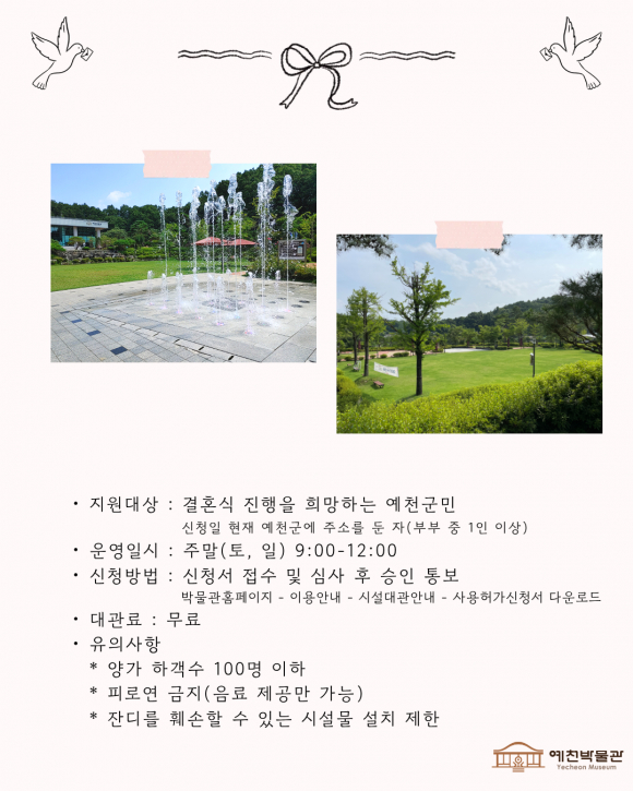 대관 대상은 신청일 현재 부부 중 1인 이상이 예천에 주소를 두고 있는 예비 부부로, 신청을 희망하는 경우 예천박물관 홈페이지에서 신청서를 내려받아 작성 후 제출하면 된다.