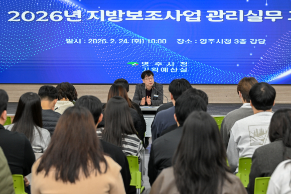 | 지방보조금 관리 실무교육 모습.<영주시 제공> | 영주시가 24일 시청 강당에서 보조사업 담당 공무원 및 신규공무원 100여 명을 대상으로 ‘지방보조금 관리 실무교육’을 실시했다.