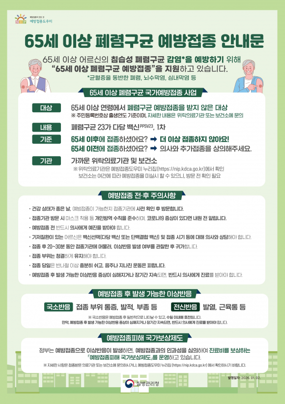 | 접종 안내문.<영주시 제공> | 영주 보건소가 65세 이상 시민을 대상으로 폐렴구균 무료 예방접종을 연중 실시하고 있다며, 대상 어르신의 적극 접종 참여를 당부했다. 폐렴구균은 폐렴뿐 아니라 패혈증, 뇌수막염 등 생명을 위협할 수 있는 침습성 감염증을 유발하는 주요 원인균이다. 특히 고령층은 면역력 저하로 감염 위험이 높고, 기저질환이 있는 경우 중증으로 진행될 가능성이 커 예방접종을 통한 사전 예방이 중요하다. 폐렴구균 예방접종은 65세 이상 어르신을 대상으로 평생 1회 접종하는 백신으로, 중증 합병증을 효과적으로 예방할 수 있다. 2026년 새롭게 65세가 되는 1961년생(1961년 12월 31일 이전 출생자)도 국가예방접종 지원 대상에 포함돼 무료 접종이 가능하다. 무료 접종 대상은 폐렴구균 23가 다당백신(PPSV23)을 한 번도 접종하지 않은 65세 이상 어르신이며, 신분증을 지참해 영주 보건소 또는 관내 위탁의료기관을 방문하면 1회 무료 접종을 받을 수 있다. 위탁의료기관 현황은 예방접종도우미 누리집에서 확인할 수 있다. 예방접종 관련 자세한 사항은 영주 보건소 예방접종실(054-639-5774~5775)로 문의하면 된다. 황순희 감염병관리과장은 “65세는 국가에서 지원하는 성인 예방접종의 중요한 기준 연령”이라며 “올해 새롭게 대상이 된 1961년생 어르신은 건강한 노후를 위해 예방접종을 꼭 챙기길 바란다”고 말했다. 이어 “폐렴은 고령층에서 입원과 사망으로 이어질 수 있는 질환인 만큼 예방접종을 통한 사전 대비가 무엇보다 중요하다”고 강조했다. |