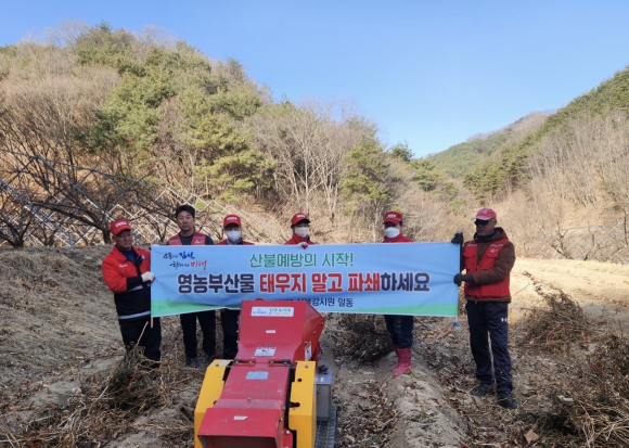 김천 대덕면이 지난 23일부터 산림 인접 농경지를 대상으로 영농부산물 수거 및 파쇄 지원에 나서며 소각 산불 사전 차단에 총력을 기울이고 있다.