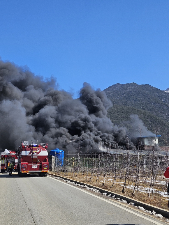 | 화재 현장사진.<문경소방 제공> | 문경소방서(서장 민병관)가 지난25일 낮 12시 56분 경 발생한 문경 마성 소재 창고 화재 현장에 소방력을 집중 투입해 인명피해 없이 화재를 완전 진압했다.