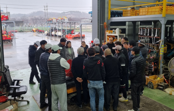 | ↑↑ 청도군 농업기술센터가 농기계임대사업소 산서분소에서 관계 공무원 등이 장비 안전교육이 열리고 있다. 청도군 제공 |