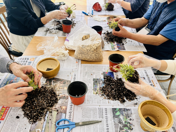 | ↑↑ 경주 동궁원 식물아카데미 수강생들이 분갈이 실습을 하며 생활원예 교육에 참여하고 있다.<경주시 제공> |