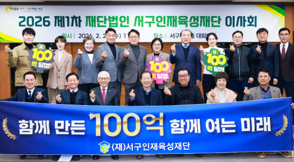 | 재단법인 서구인재육성재단이 지난 25일 오전 11시 서구청 3층 대회의실에서 ‘2026년 제1차 이사회’를 개최하고 기본재산 100억 원 달성을 축하하는 기념 촬영을 진행했다.