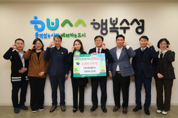 | ↑↑ ㈜세진쉴더스가 대구 수성미래교육재단에 장학금 500만 원을 전달했다. 수성구 제공 |