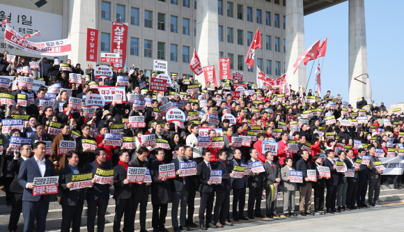 대구·경북 지역구 국힘 의원과 지역 주민들이 4일 서울 여의도 국회 본관 앞에서 열린 대구경북 통합법 처리 촉구 결의대회에서 함께 구호를 외치고 있다.뉴스1