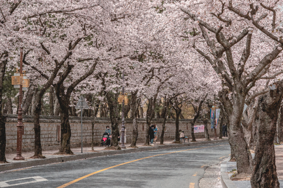 ▲경주 대릉원 벚꽃 경주 대릉원 일대는 벚꽃이, 경주에서 가장 먼저 떠올리는 봄 풍경을 만든다. 특히 대릉원 돌담길 벚꽃길은 경주의 봄을 대표하는 산책 코스로, 낮은 돌담을 따라 벚나무가 이어져 걷는 내내 꽃이 시야를 가득 채운다.