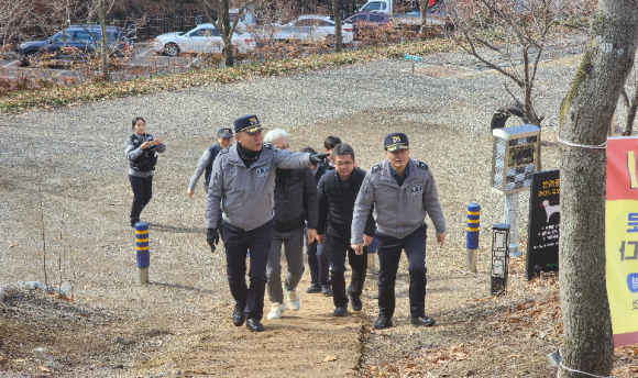 | ↑↑ 영천 완산동 소재 금강산성 등산로를 방문하여 안전시설물을 합동 점검했다.<영천경찰서 제공> |