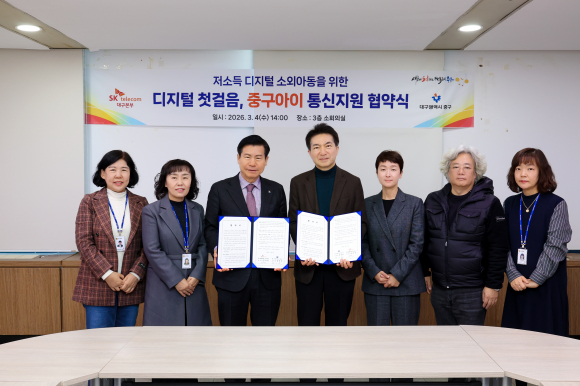 | 대구 중구와 ㈜SK텔레콤 대구본부가 지난 4일 저소득 디지털 소외 아동의 정보격차 해소와 디지털 접근성 보장을 위한 ‘디지털 첫걸음, 중구아이 통신지원’ 업무협약을 체결했다.