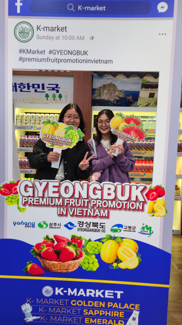 베트남 ‘K-MARKET(케이마켓)’ 골든팰리스점 행사장에서 경북 과일을 맛본 ‘응우옌 티 타오’씨(22세, 하노이)는 “한국 드라마에서 보던 한국 과일의 맛이 늘 궁금했다”며, “여기 과일은 현지 과일과 다르게 맛과 향이 모두 달콤해 놀랐다“며 경북 과일에 수줍은 손가락 하트를 보내기도 했다.