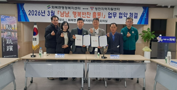 영천 화북 행정복지센터와 지역자활센터가 9일 화북 행정복지센터에서 취약계층 식생활 지원을 위한 ‘냠냠, 행복반찬 출동!’ 업무협약(MOU)을 체결했다.