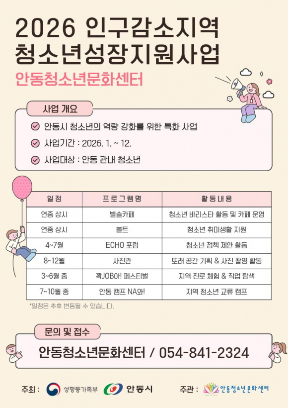 성평등가족부와 안동시가 지원하고 안동청소년문화센터가 주관하는 ‘2026 인구감소지역 청소년성장지원’사업이 지난해에 이어 2년 연속 운영된다.