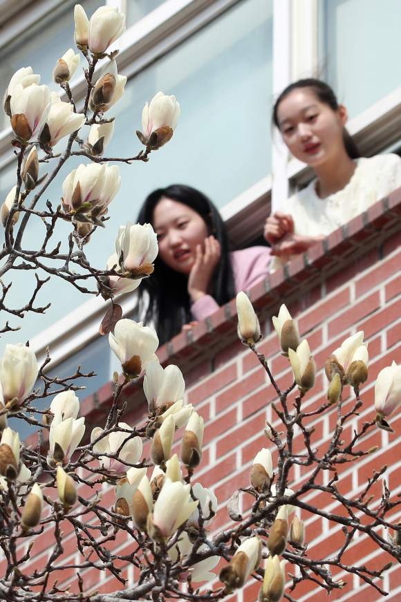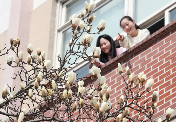 10일 오전 대구 북구 영진전문대 복현캠퍼스에서 꽃망울을 터뜨린 목련이 봄소식을 전하고 있다.뉴스1 |