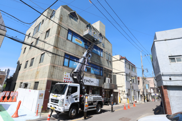 | ↑↑ 지난해 중구가 노후된 이용간판과 돌출간판을 철거 하고 있다. 중구 제공 |