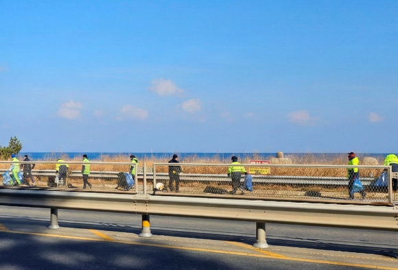 ↑↑ 환경위생과 직원과 단속 요원이 국도변에서 불법 쓰레기를 수거하고 있다.<영덕군 제공>