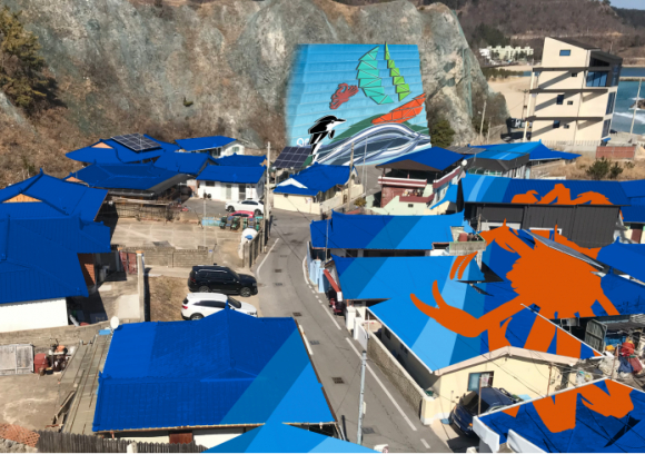 경관사업 핵심은 마을 지붕을 하나의 캔버스처럼 활용하는 ‘슈퍼그래픽’기법 도입이다. 관광객이 등기산 출렁다리에서 마을을 내려다 봤을 때 후포를 상징하는 거대한 ‘게’형상이 입체적으로 드러나도록 설계됐다.