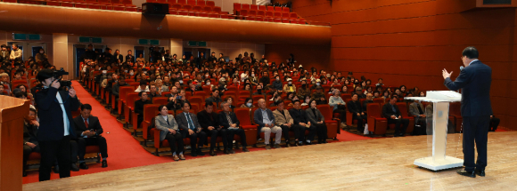 | ↑↑ 13일 서라벌문화회관에서 열린 ‘SMR 1호기 경주 유치 시민설명회’에서 주낙영 경주시장이 시민들을 대상으로 SMR 1호기 유치 필요성과 경주의 미래 산업 전략에 대해 설명하고 있다.<경주시 제공> |