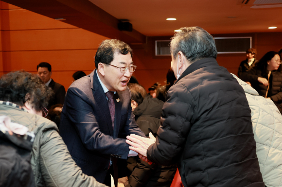 | ↑↑ 주낙영 경주시장이 13일 서라벌문화회관에서 열린 ‘SMR 1호기 경주 유치 시민설명회’에서 참석 시민들과 인사를 나누고 있다.<경주시 제공> |