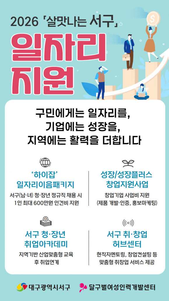 대구 서구가 지역 청‧장년에게 안정적 일자리를 제공하고 기업 성장을 지원하기 위해 ‘2026년 살맛나는 서구 일자리 지원사업’을 추진한다.