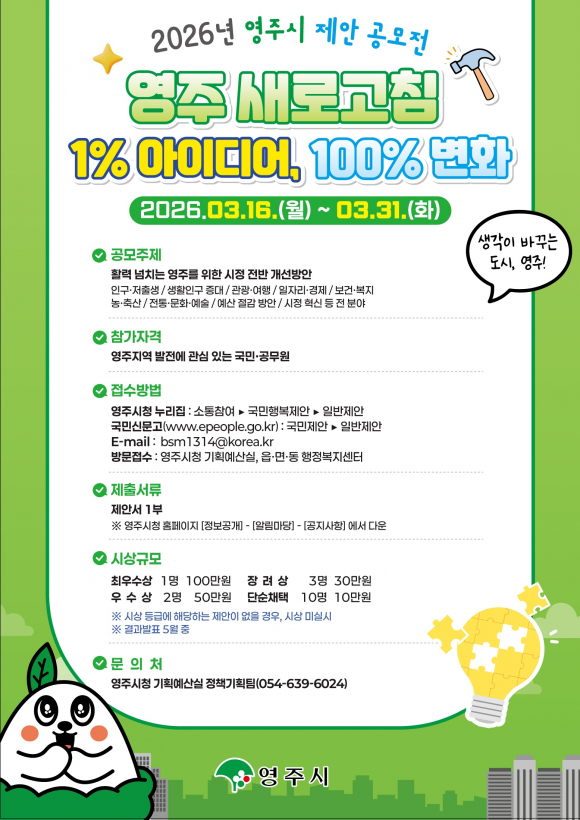 이항규 기획예산실장은 “시민의 작은 아이디어가 모여 영주의 미래를 바꾸는 큰 변화로 이어질 것”이라며, “이번 공모전에 많은 관심과 적극적인 참여를 부탁드린다”고 전했다.