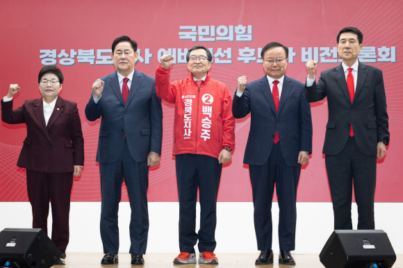 국힘 경북도지사 예비후보들이 16일 서울 여의도 중앙당사에서 열린 국힘 경상북도지사 예비경선 후보자 비전토론회에서 기념 촬영 하고 있다. 왼쪽부터 임이자, 최경환, 백승주, 김재원, 이강덕 예비후보.뉴스1