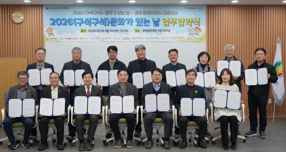 ↑↑ 청도우리정신문화재단이 경북문화재단과 ‘2026 구석구석 문화가 있는 날’ 사업 추진을 위한 협약을 체결하고 참석자들과 단체기념촬영을 하고 있다. 청도군 제공