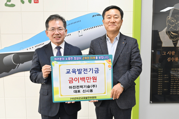 (사)군위교육발전위 김진열 이사장은 “어려운 경제 여건 속에서도 지역 교육을 위해 소중한 기탁을 결정해 준 아진전력에 진심으로 감사드린다”고 밝혔다. |