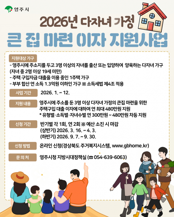 | 다자녀가정 큰 집 마련 이자 지원 홍보 이미지.<영주시 제공> | 영주시가 관내 3자녀 이상 다자녀가구의 주택 구입 자금 대출이자를 지원하는 ‘2026년 다자녀가정 큰 집 마련 이자 지원사업’ 신청을 지난 16일~오는 4월 3일까지 접수한다. 이번 사업은 자녀 수 증가에 따라 넓은 주거공간 수요가 높아지는 점을 반영해, 다자녀 가정의 주거비 부담을 완화하고 안정적인 정착을 지원하기 위해 추진된다. 신청 대상 가구는 관내 3자녀 이상 다자녀 가구(자녀 중 2명 이상이 19세 미만)로 부부 합산 연 소득 1억 3000만 원 이하면서 주택 대출을 이용 중인 1주택 가구로, 전용면적 124㎡ 이하면서 주택 가격 9억 원 이하 주택 구입 자금 대출 이자를 소득 기준과 자녀 수에 따라 연 최대 480만 원까지 차등 지원한다. 신청은 경북 주거복지시스템(www.gbhome.kr)을 통한 온라인 접수로 진행되며, 기타 자세한 사항은 영주시청 홈페이지(www.yeongju.go.kr) 고시/공고를 참조하면 된다. 홍성호 영주시 지방시대정책실장은 “아이를 키우면서 가장 큰 고민 중에 하나가 주거 공간의 협소함과 대출 이자 부담”이라며, “사업을 통해 다자녀 가정이 보다 안정적 주거 환경에서 아이를 키울 수 있도록 앞으로도 실질적 지원을 이어가겠다”고 했다. |