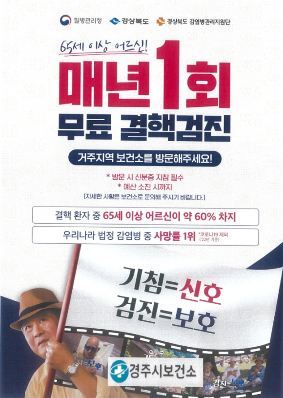 | ↑↑ 경주시보건소, 65세이상 어른신 '매년 1회 무료 결핵검진' 홍보 포스터<경주시 제공> |