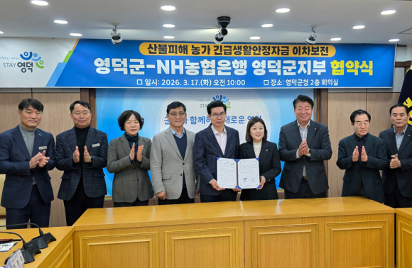 | 영덕군이 지난해 3월 말 발생한 경북산불로 어려움을 겪는 농가의 조속한 영농 재기를 돕기 위해 지난 17일 NH농협은행 영덕지부와 ‘긴급생활안정자금 이자 지원사업’을 위한 업무 협약을 맺었다.