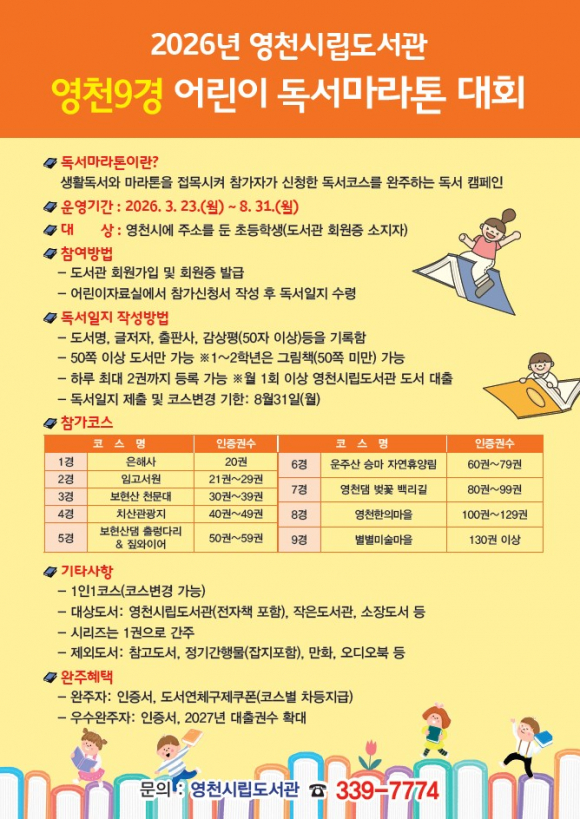 영천 평생학습관이 오는 23일~8월 31일까지 초등학생의 독서 활성화를 위해 ‘영천9경 어린이 독서마라톤 대회’를 운영한다.