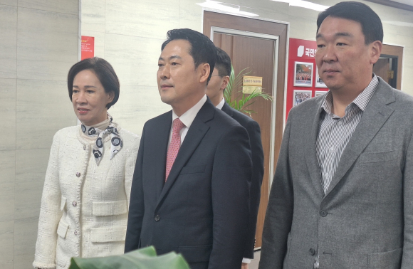 | ↑↑ 장동혁 국민의힘 대표(가운데)가 22일 오전 오는 지방선거에서 대구시장 공천과 관련해 대구지역 국회의원들과 만나고자 대구시당을 방문하고 있다. 황보문옥 기자 |