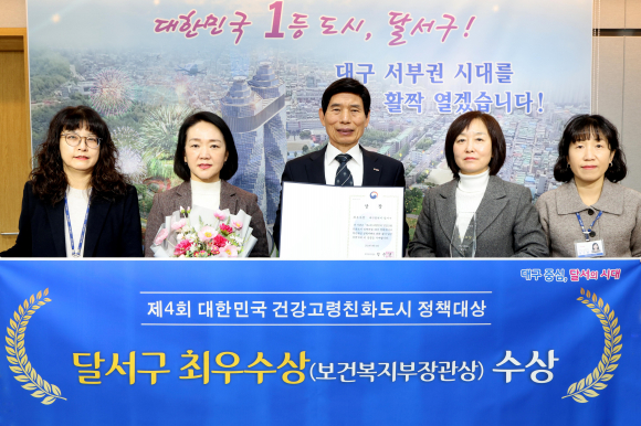 ↑↑ 이태훈 대구 달서구청장(가운데)이 제4회 대한민국 건강고령친화도시 정책대상에서 최우수상을 수상하고 직원들과 기념촬영을 하고 있다. 달서구 제공