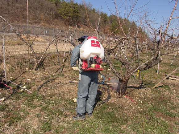 동계 방제 핵심인 석회유황합제는 강알칼리 성분이 병원균과 해충의 조직을 부식시키는 원리로 살균과 살충 효과를 동시에 기대할 수 있다.