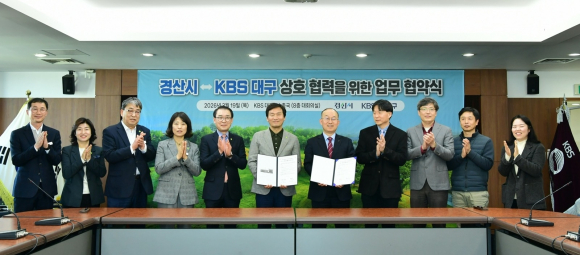 | ↑↑ 조현일 경산시장(가운데)이 KBS대구방송총국과 상호 협력을 위한 업무협약식을 갖고 기념촬영을 하고 있다. 경산시 제공 |