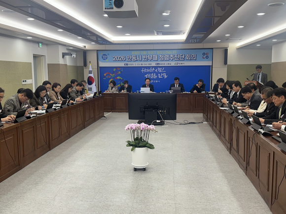 | 안동시가 지난 23일 시청 웅부관 소통실에서 권기창 시장을 비롯한 부시장, 국·소장 등 간부공무원이 참석한 가운데 ‘2026년 반부패·청렴 추진단 회의’를 개최하고, 종합청렴도 향상을 위한 추진체계와 반부패·청렴 종합계획을 공유했다.