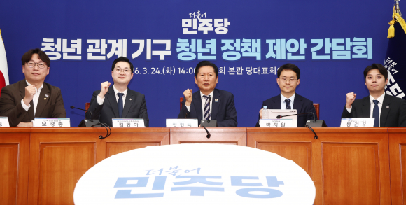 | ↑↑ 정청래 더불어민주당 대표가 24일 오후 서울 여의도 국회에서 청년 관계 기구 청년 정책 제안 간담회에서 참석자들과 기념촬영을 하고 있다.<뉴스1> |